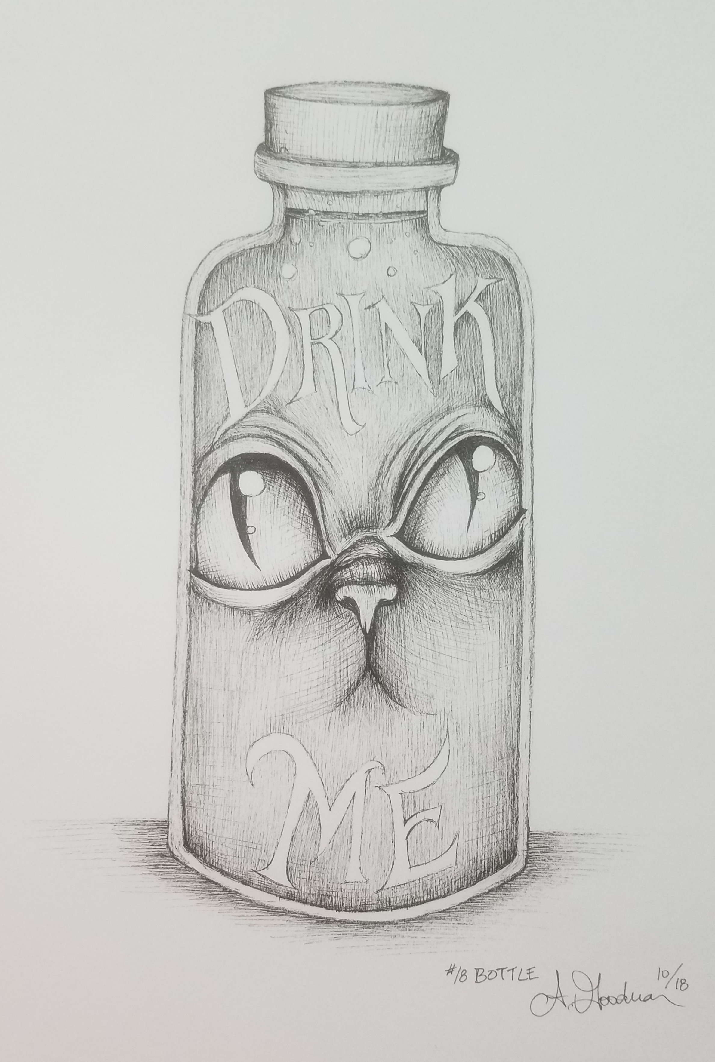 2018 Inktober Day 18 Bottle ink drawing with Cheshire cat drink me by alecia goodman