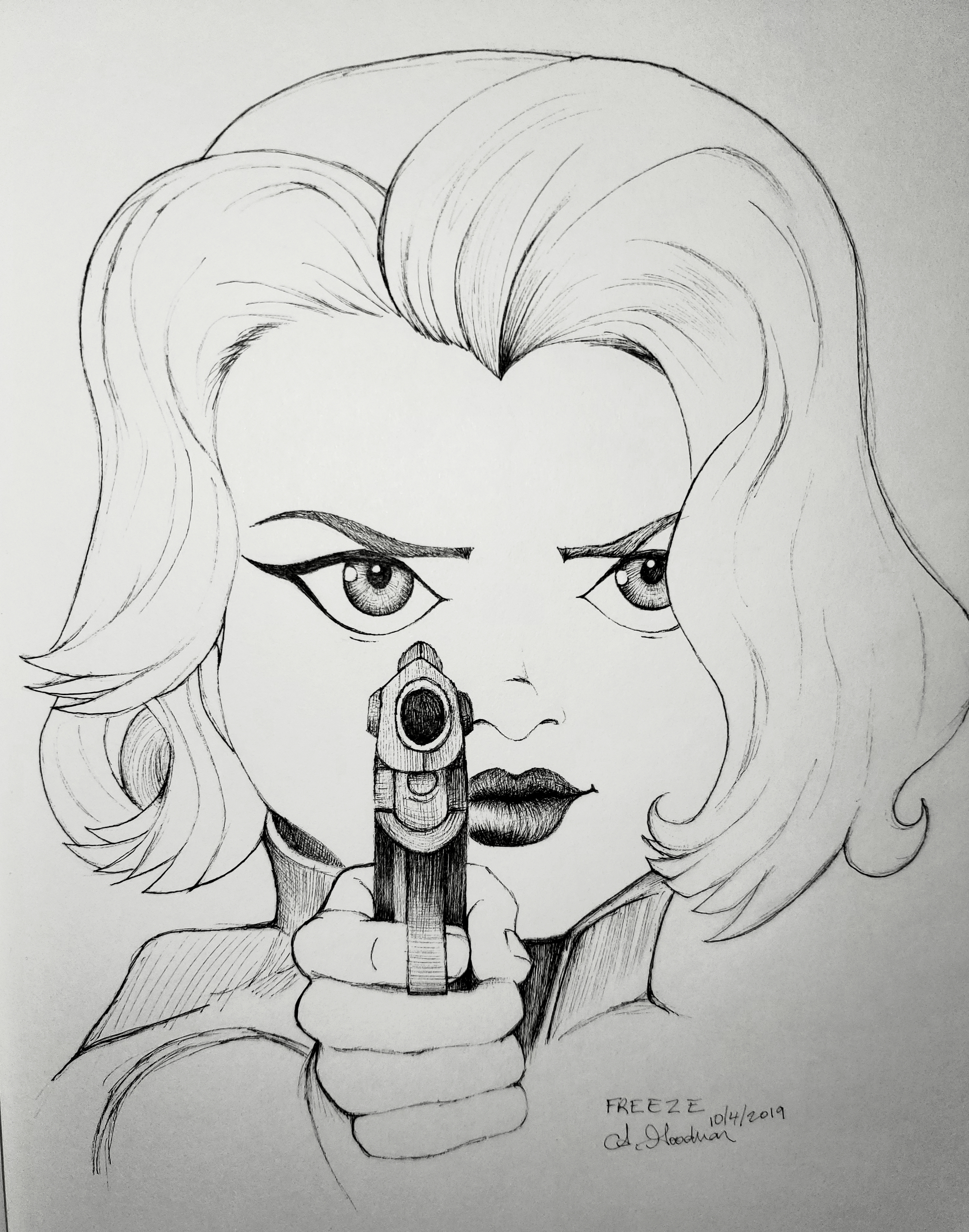 Ink drawing of woman holding gun by Alecia Goodman