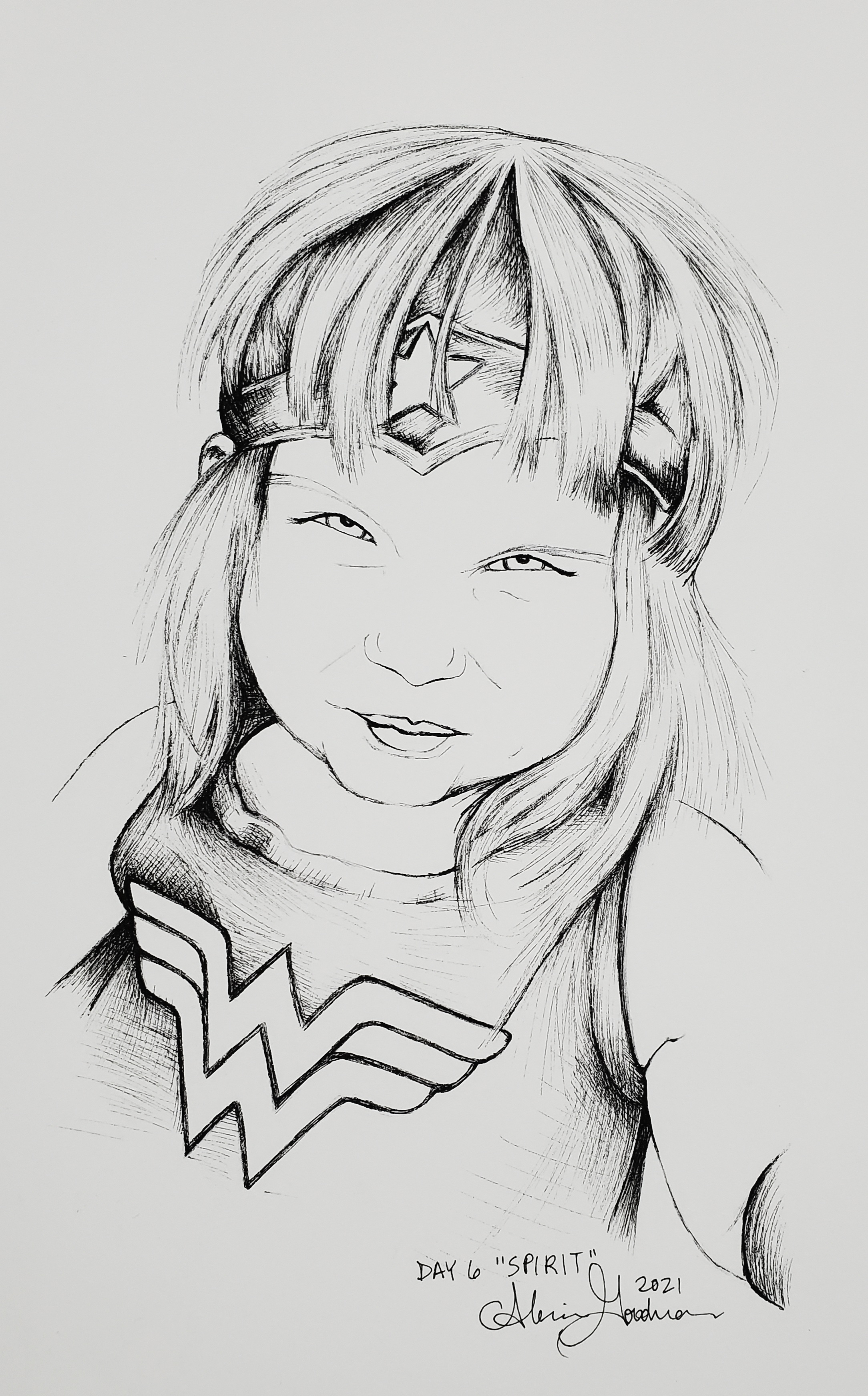I love the spirit my daughter has especially when she’s Wonder Woman. It’s the one costume that has to be replaced as she grows. Definitely a warrior princess. #Inktober2021, #Inktober, #spirit, #wonderwoman, #costume, #ink, #art, #drawing, #aleciagoodman,