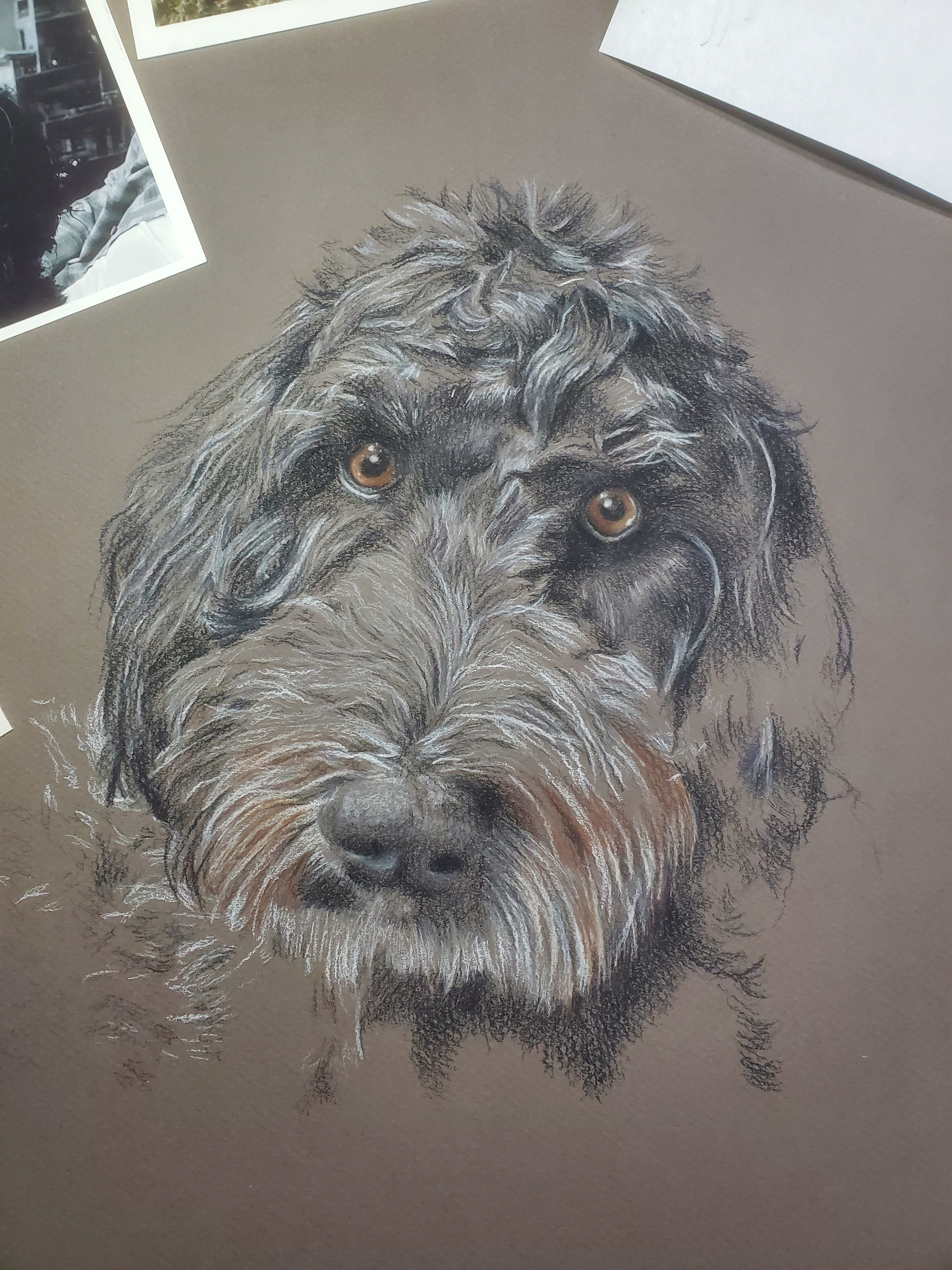 Labradoodle dog portrait by alecia goodman copyright 2022 pastels